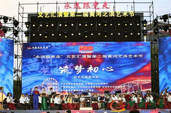 “永遠跟黨走”文藝匯演暨第二屆黃河之濱藝術(shù)節(jié)于7月11日晚在甘肅蘭州體育文化廣場拉開帷幕。由甘肅演藝集團歌舞劇院排演的大型民族交響音樂會《筑夢·初心》作為開幕演出,吸引各界觀眾約4000余人共聚黃河之濱觀看。
