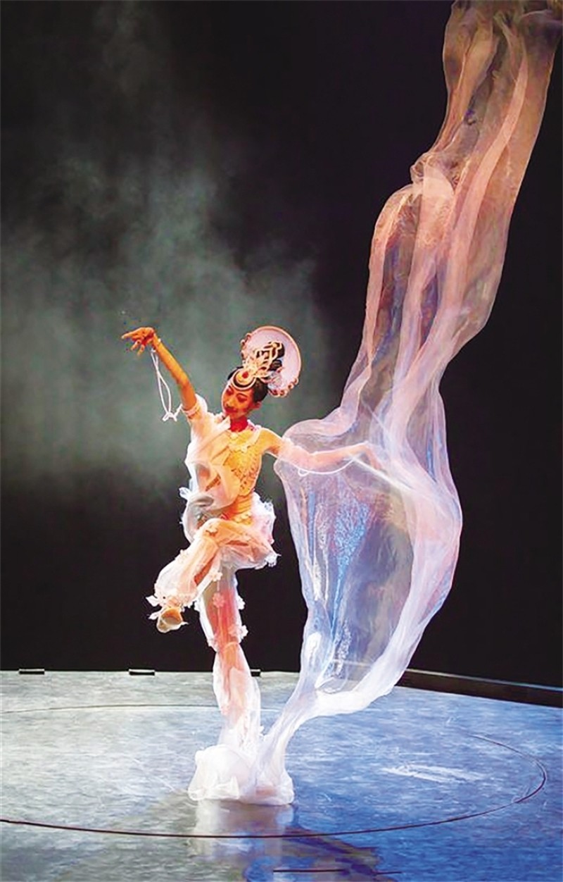 “壁畫中大多數(shù)飛天的服飾有飛紗或飄帶,營造一種仙氣飄飄的氛圍。但這個舞蹈中,飛紗并不是簡單的裝飾,而是飛天的一縷靈魂。千變?nèi)f化的飛紗與飛天并肩起舞,賦予舞蹈強烈飽滿的美感,讓舞蹈更具觀賞性?!蓖蹙Ьдf,舞臺運用的風機是飛紗持續(xù)在空中飛舞而不會飛走或掉在地上的秘訣。