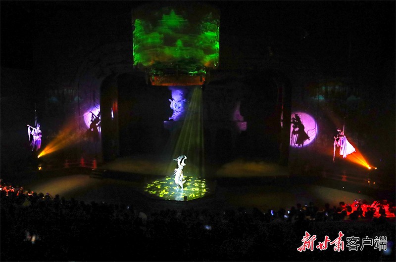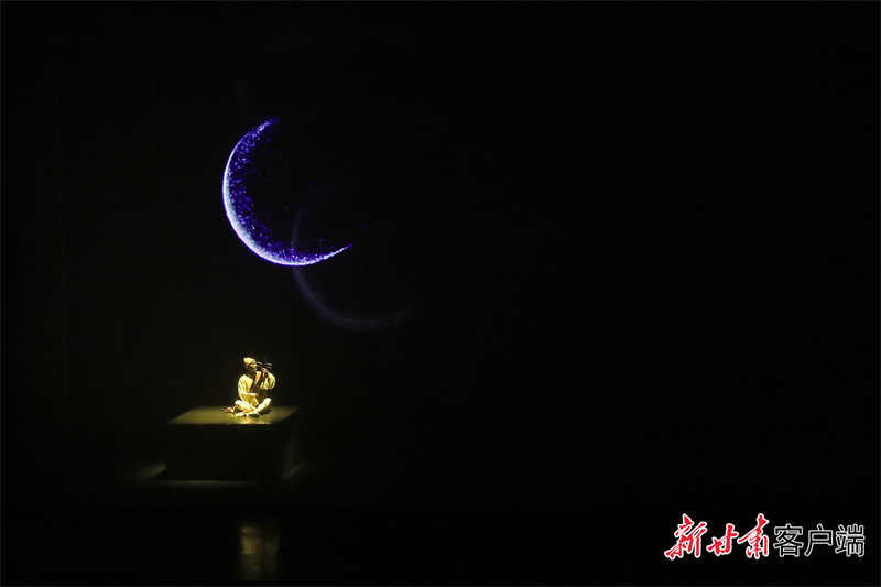 《樂動敦煌》以“樂、舞、詩、畫”為鑰匙,開啟了穿越古今的時空之門,打破了人和舞臺間的界限,讓觀眾置身劇場。劇情溯源敦煌文化,借助對莫高窟壁畫、藏經(jīng)洞出土敦煌文獻的深度解讀梳理,活化敦煌古樂器、古樂譜研發(fā)成果,采用全息投影、3D威亞等高科技手段,以沉浸式的呈現(xiàn)方式,演繹了西域少年白歆追尋藝術(shù)的動人故事,讓觀眾在可看、可聽、可游走的洞窟式劇場內(nèi),零距離感受敦煌文化魅力。