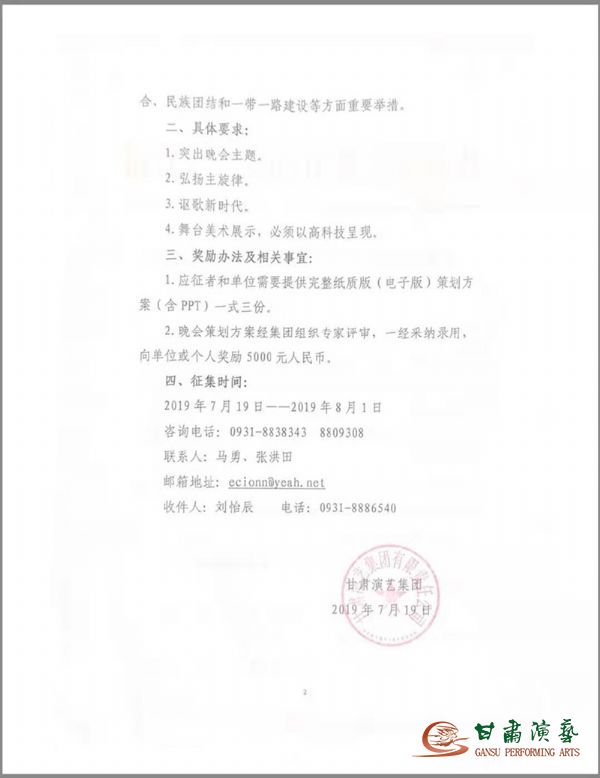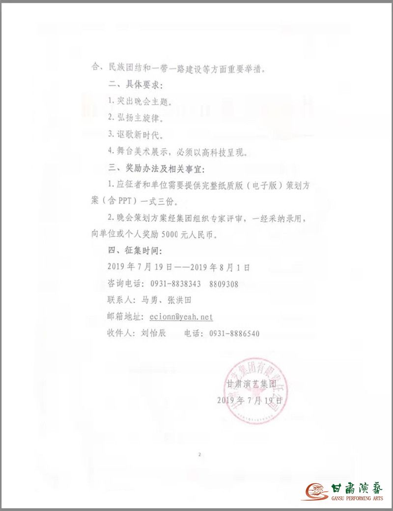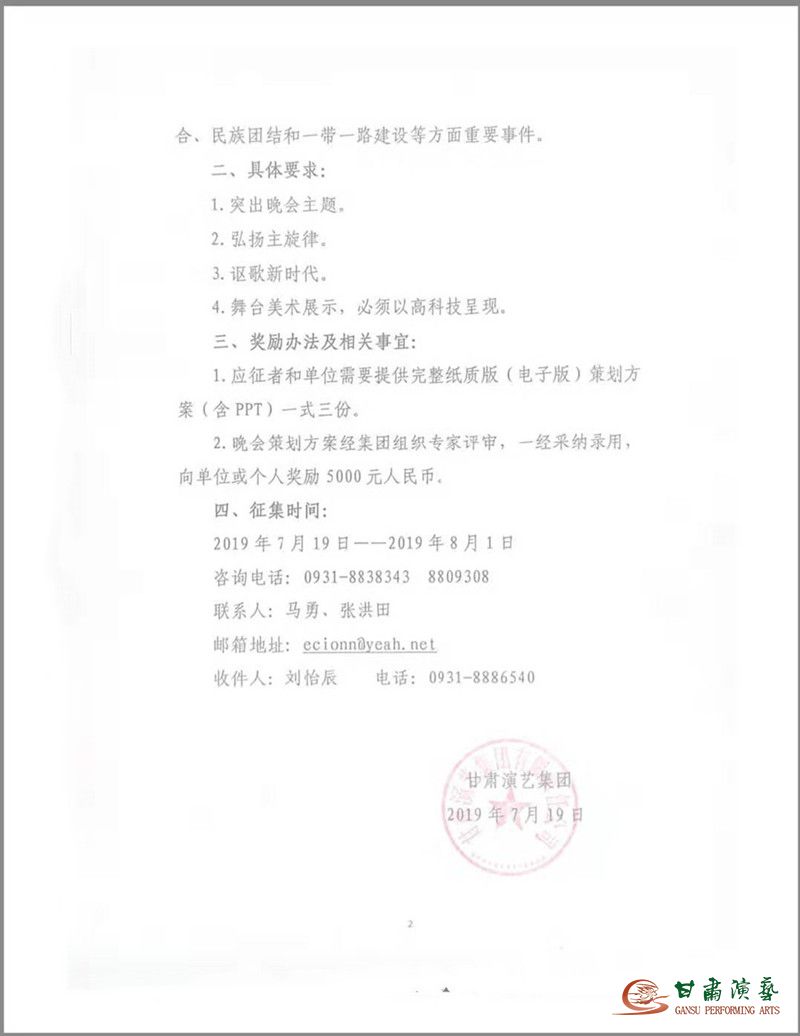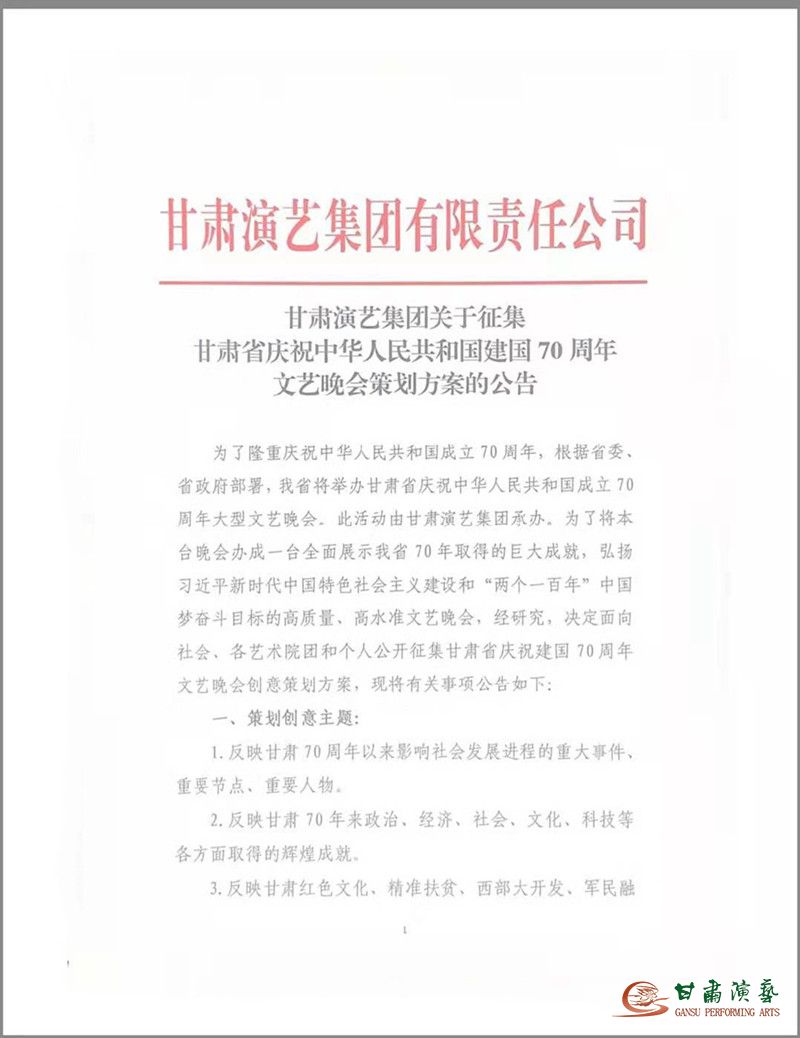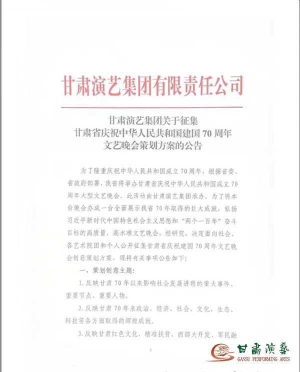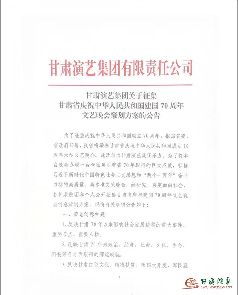 為了隆重慶祝中華人民共和國(guó)成立70周年,根據(jù)省委、省政府部署,我省將舉辦甘肅省慶祝中華人民共和國(guó)成立70周年大型文藝晚會(huì)。此活動(dòng)由甘肅演藝集團(tuán)承辦。為了將本臺(tái)晚會(huì)辦成一臺(tái)全面展示我省70年取得的巨大成就,弘揚(yáng)習(xí)近平新時(shí)代中國(guó)特色社會(huì)主義思想和“兩個(gè)一百年”奮斗目標(biāo)的高質(zhì)量、高水準(zhǔn)文藝晚會(huì),經(jīng)研究,決定面向社會(huì)、各藝術(shù)院團(tuán)和個(gè)人公開(kāi)征集甘肅省慶祝建國(guó)70周年文藝晚會(huì)創(chuàng)意策劃方案,現(xiàn)將有關(guān)事項(xiàng)公告如下: